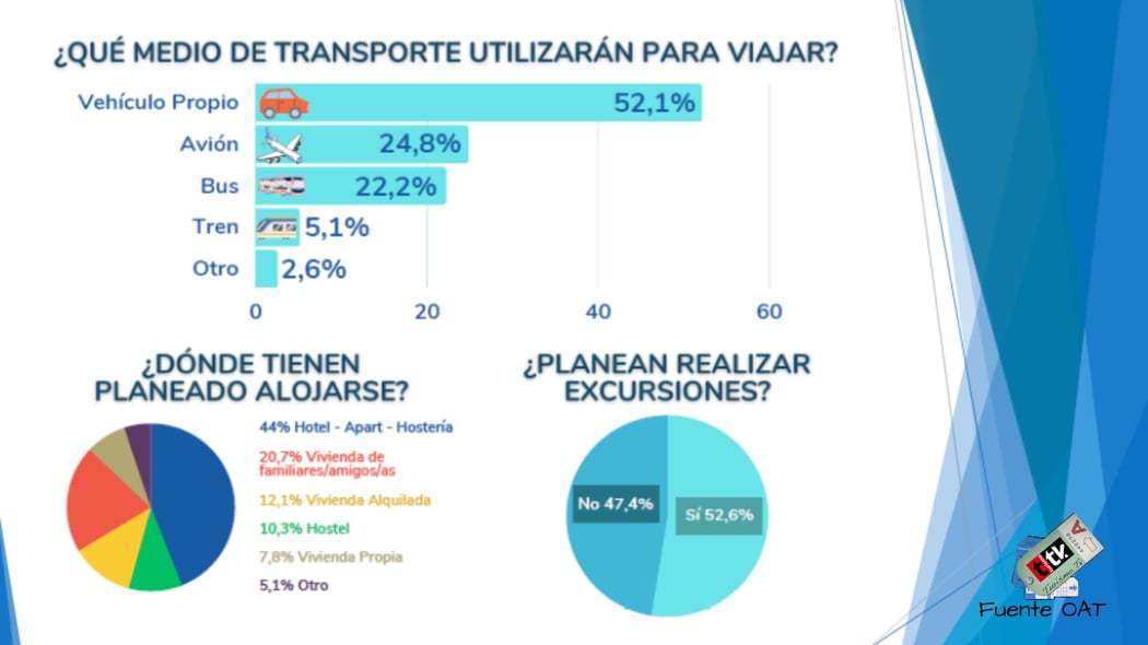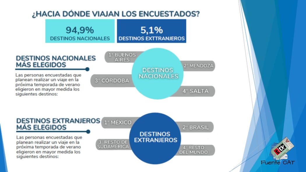 El Observatorio Argentino de Turismo (OAT) de la Federación Argentina de Asociaciones de Empresas de Viajes y Turismo (FAEVYT) aporta datos claves en relación a como los argentinos deciden sus viajes, que destinos eligen , como se transportan y con que gasto promedio. A continuación los resultados de la última encuesta realizada por OAT: